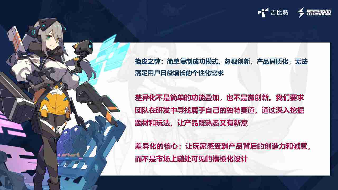 在我们内部是这么定义差异化的。。首先,,,,差异化不是简单的功能叠加,,更不是换皮。。。。只是换皮,,产品无法提供有效的市场价值。。内部经常说差异化的产品不是为了迎合市场,,,而是找到一个自己独特的表达方式,,在研发中找到属于自己的细分赛道和独特赛道,,,,前提是需要对这个题材有足够的深入、、、、挖掘,,对玩法有足够深入的理解,,让产品看起来既熟悉又有新意。。。