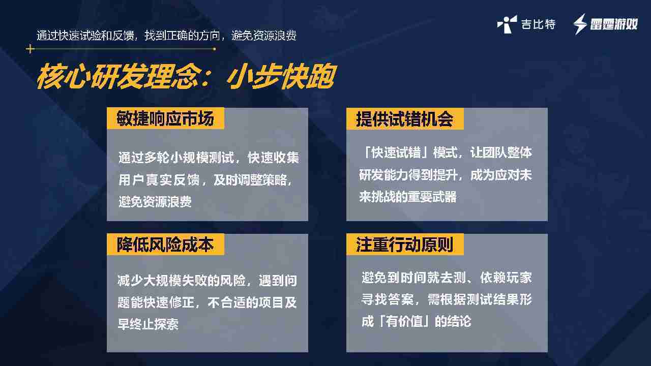 小步快跑不是找答案,,,而是验证答案。。。。我们之前有项目是这样的,,有些制作人会有几个方向觉得都可以做,,,,但是不确定做哪一个,,会选择几个都做,,,,做完拿到市场跑,,,跑出哪一个更好,,,,基于这个再做后续的研发和拓展。。但这种情况最容易出现一个问题,,,可能被玩家裹胁,,,玩家说这个点不错、、、、那个点不错,,,到底听还是不听,,不听感觉是无视玩家的反馈,,,听的话,,可能自己没想清楚导致研发思路发生偏颇。。所以针对这一点后面自己复盘整理,,发现制作人自己心里要有数,,,要做自己觉得好玩的,,而且明确知道这个东西是你想做的,,然后拿到市场验证这个答案是不是对的,,而不是拿一堆答案找哪一个答案更好。。。