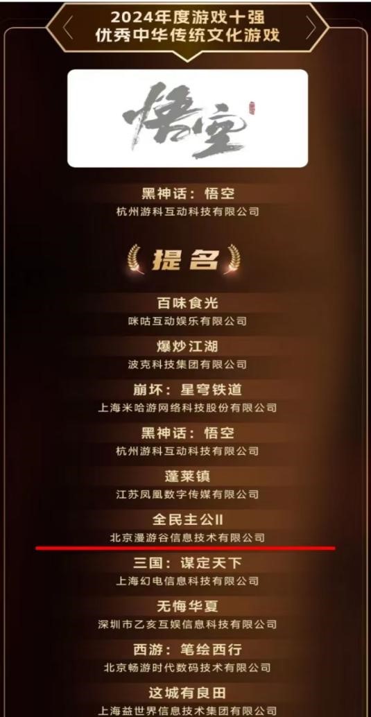 在2024年度备受瞩目的游戏界盛会上,,,年度“游戏十强”榜单终于揭晓。。经过一系列激烈的竞争和严格的评审流程,,公司产品《全民主公II》凭借其卓越的游戏品质和庞大的玩家基础,,,,荣获“2024优秀中华传统文化游戏”提名。。。此奖项被誉为“第九艺术封神榜”,,,因其突出的影响力、、、、公信力成为中国游戏产业最高奖项。。。