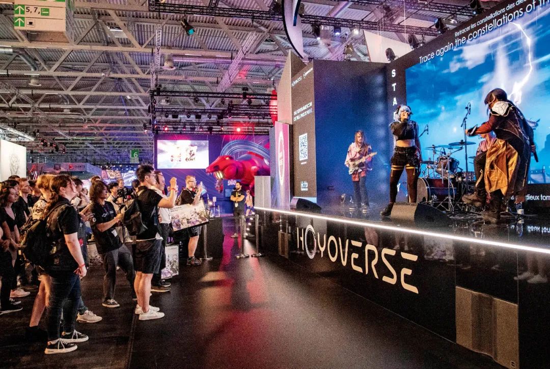 2023年8月23日,,,德国科隆游戏展期间,,,,人们在米哈游展台观看乐队表演游戏歌曲。。。图/新华